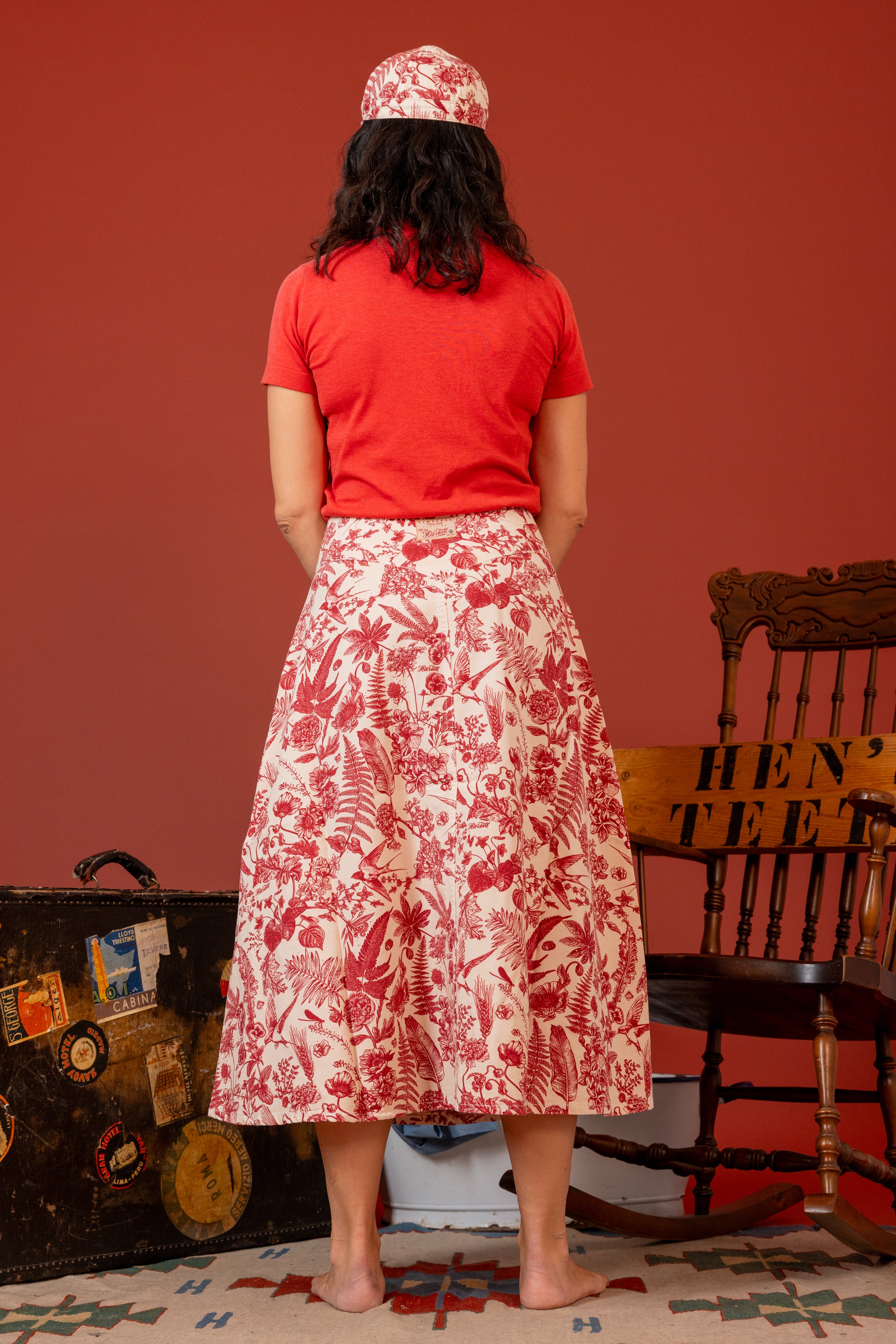 Skirt made of 100% Italian cotton canvas, with hand-drawn all-over botanical prints and Hen's Teeth logo.