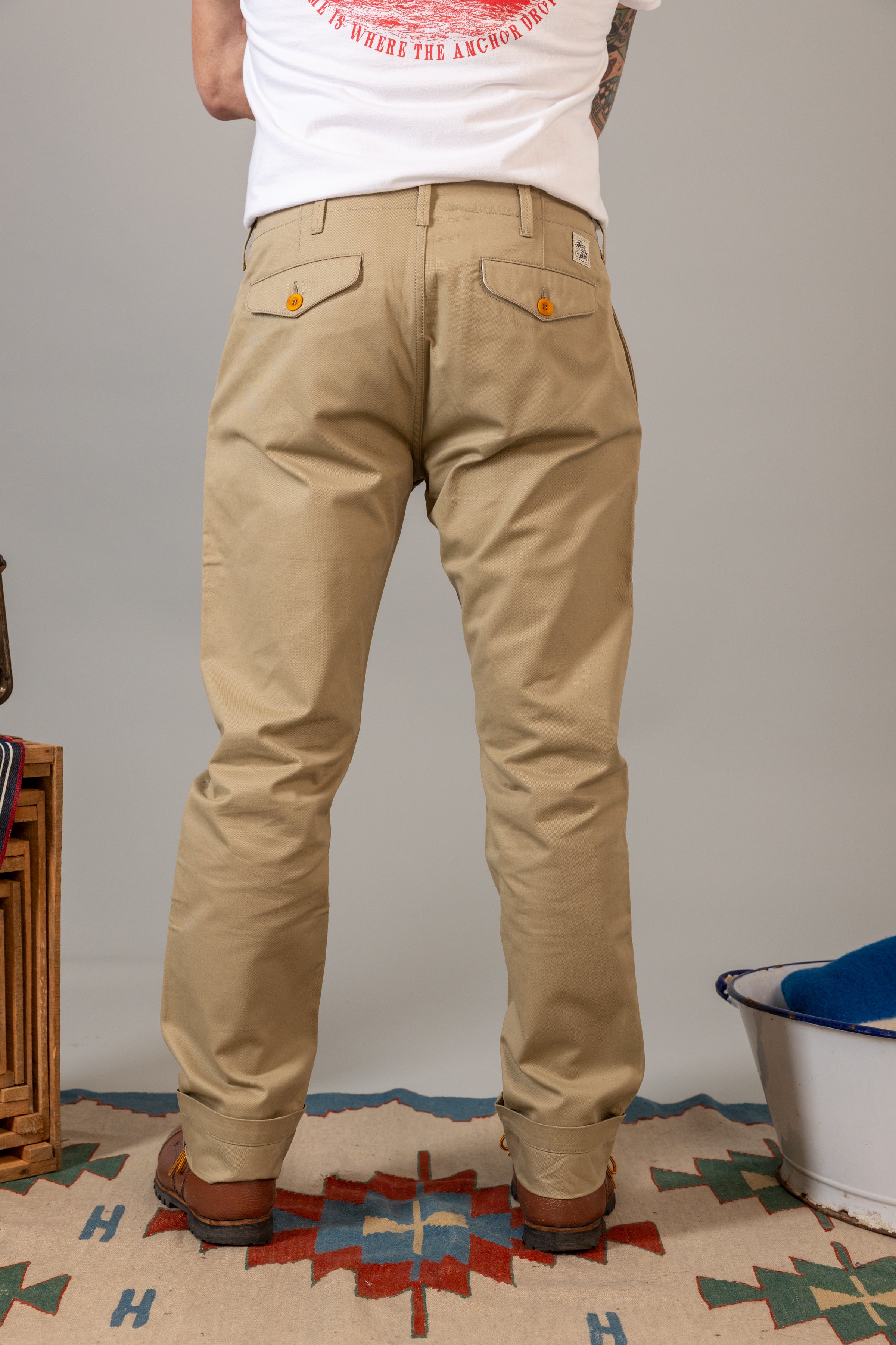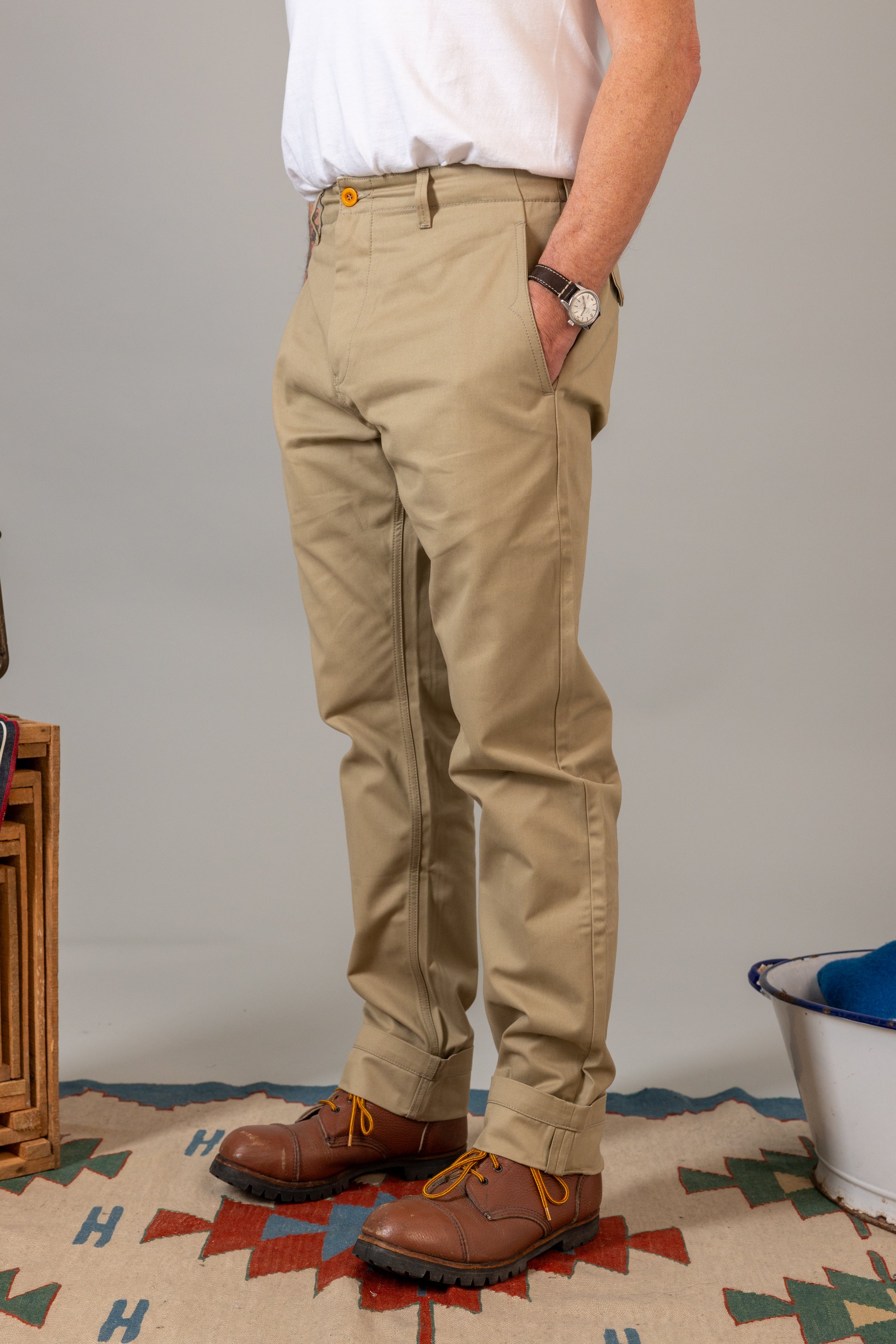 The Hen's Teeth "Triple Twisted" drill chinos are precision-crafted and feature a unique "Triple Twisted" fabric construction, which combines three layers of twisted yarns for exceptional strength and a distinctive texture.