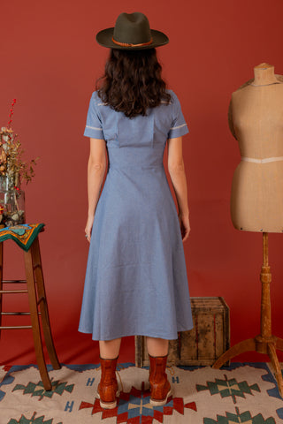 Abito in chambray Tombolo ispirato agli abiti femminili delle praterie americane, realizzato in tessuto chambray di cotone 100% italiano, con dettagli e forme tipici di questo stile.