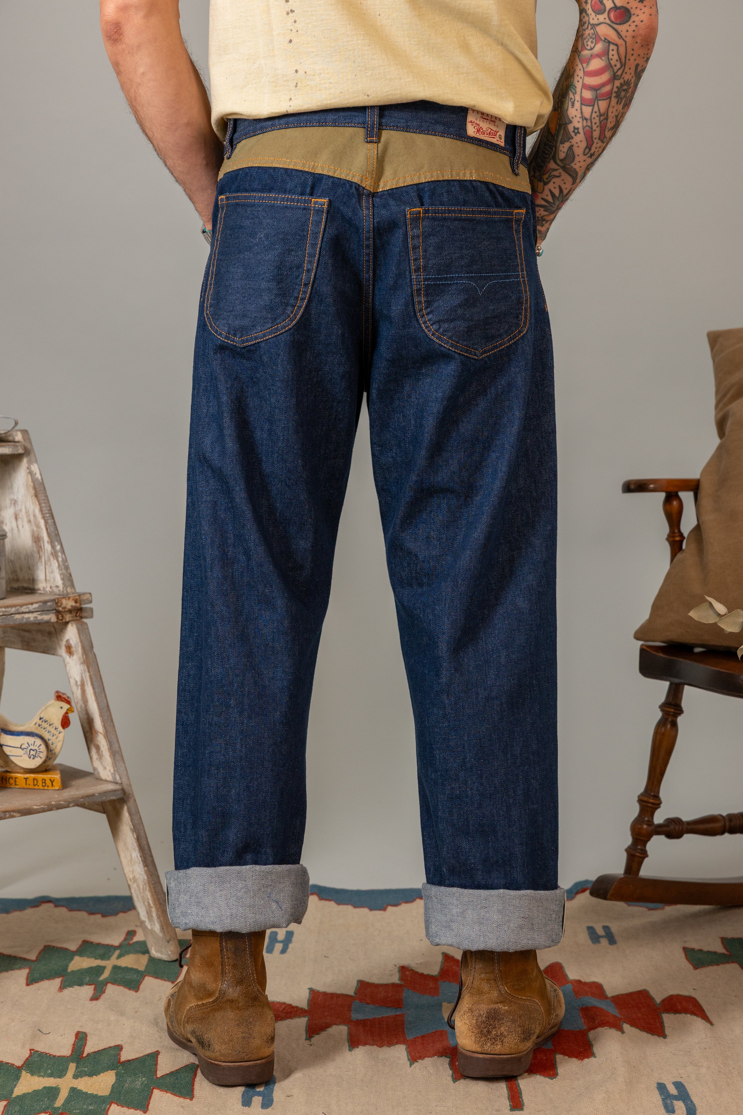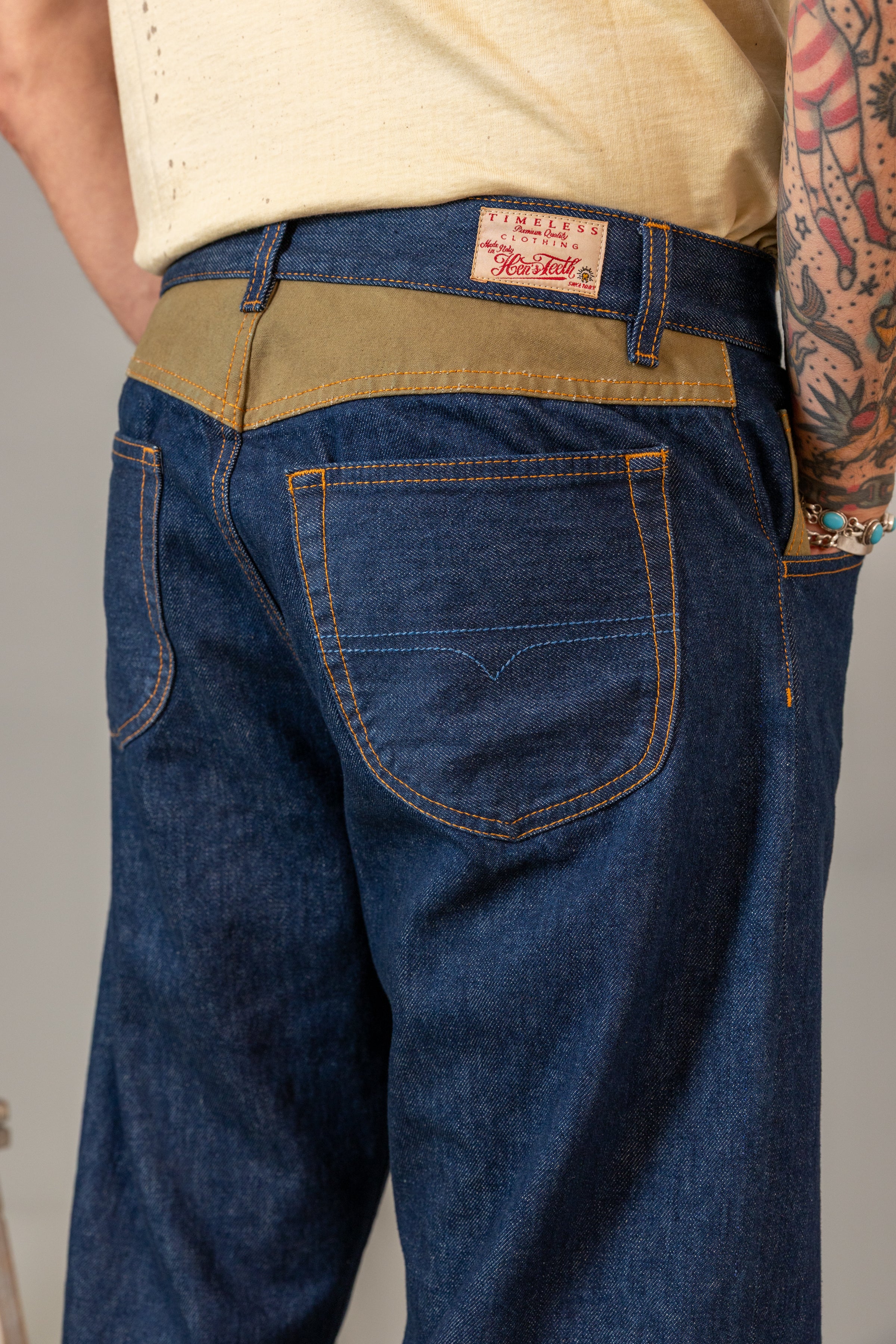 Ogni dettaglio racconta una storia: tasche in autentico tessuto militare degli anni '50, conferendo carattere storico al capo, il bottone in ottone personalizzato Hen's Teeth, ricami artigianali eseguiti a mano. La struttura interna testimonia la meticolosità costruttiva con cucitura a catenella lungo la cintura e l'orlo inferiore, fodera in puro cotone italiano e rivetti in rame martellati manualmente.