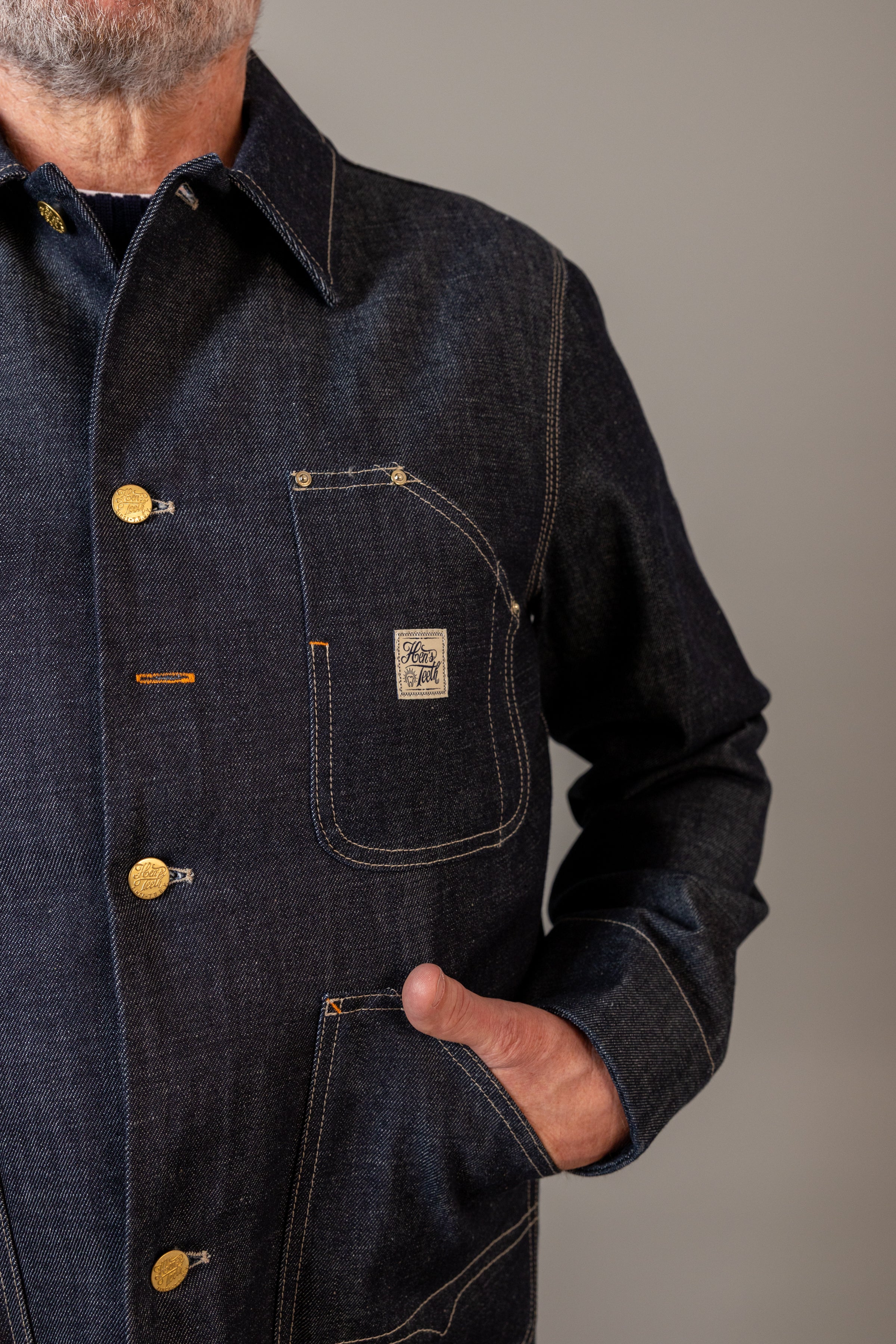 La giacca da lavoro in denim di Hen's Theeth combina la resistenza e la lavorazione artigianale del denim cimosato con il design funzionale di una giacca da lavoro.